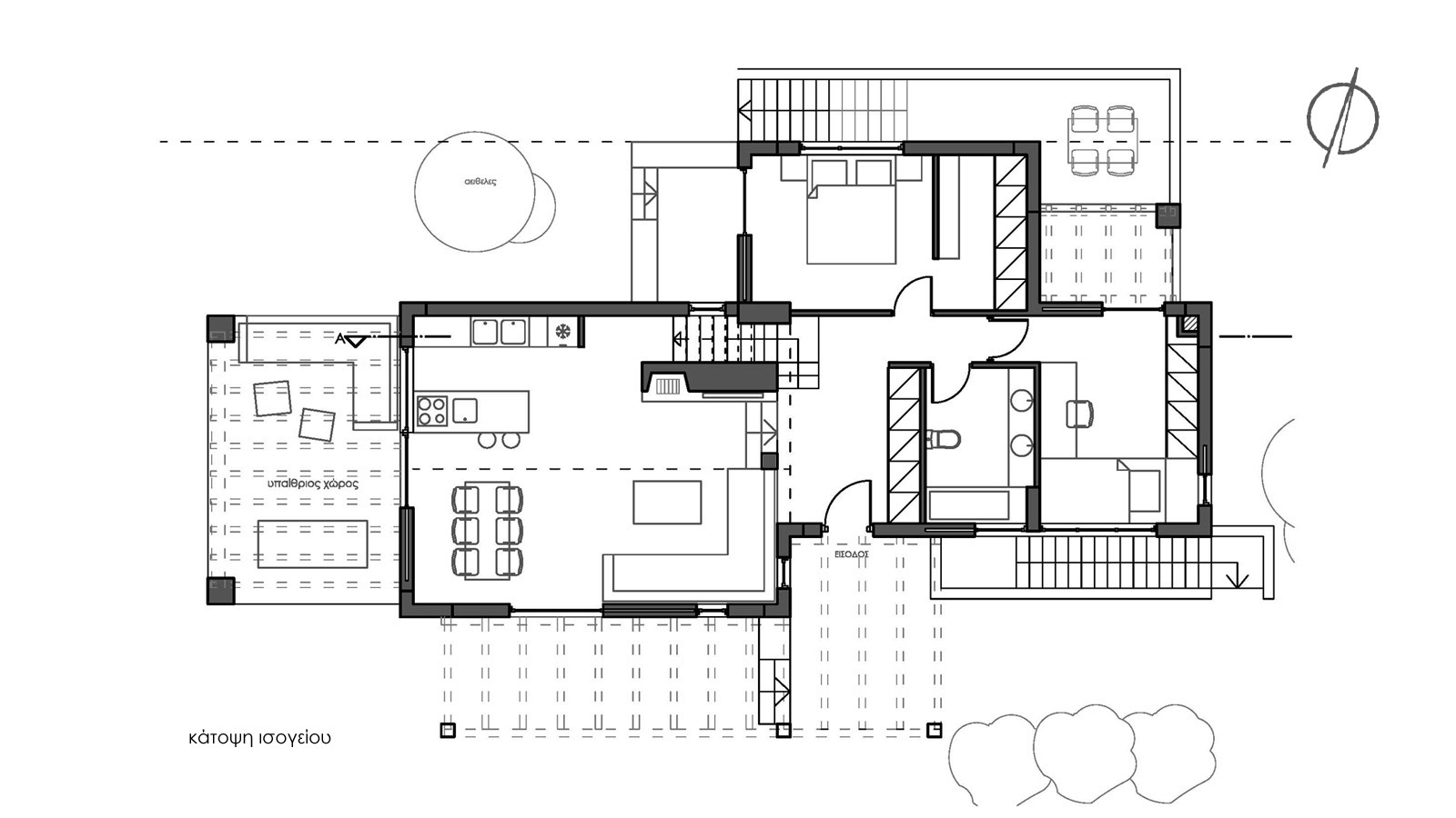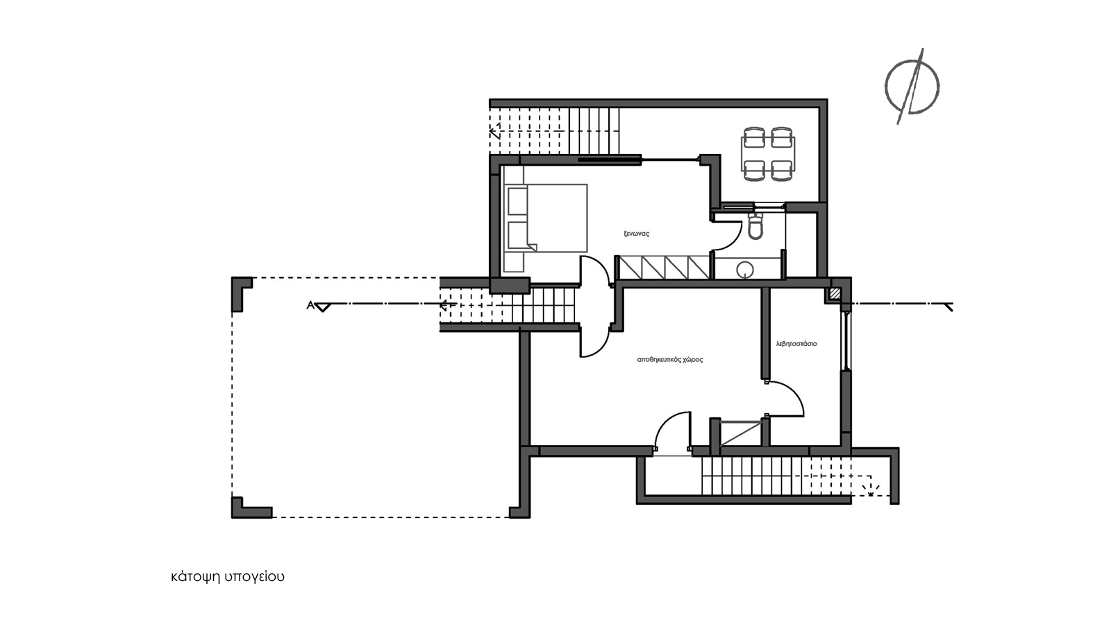 ‘Ολη η κάτοψη οργανώνεται στο ισόγειο, ενώ στο χώρο του σαλονιού, ένα εσωτερικό πατάρι προβλέπεται για γραφείο. Το υπόγειο αποτελούν αποθήκη, λεβητοστάσιο και ένας ανεξάρτητος απο τους αποθηκευτικούς χώρους, ξενώνας με άμεση πρόσβαση στην αυλή.