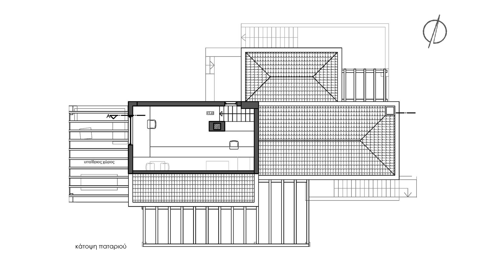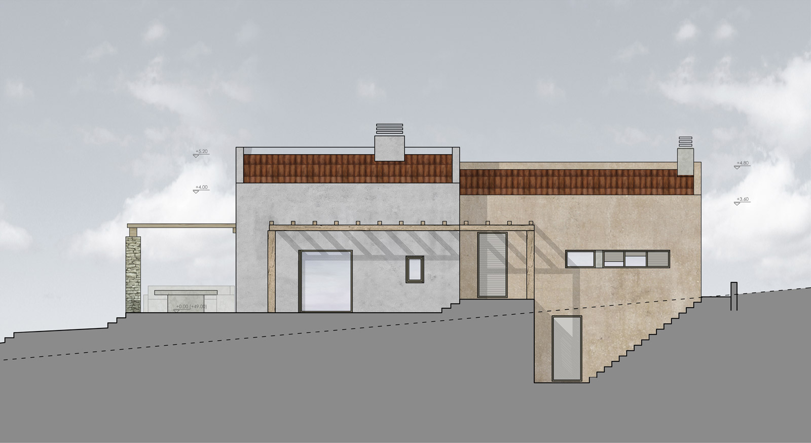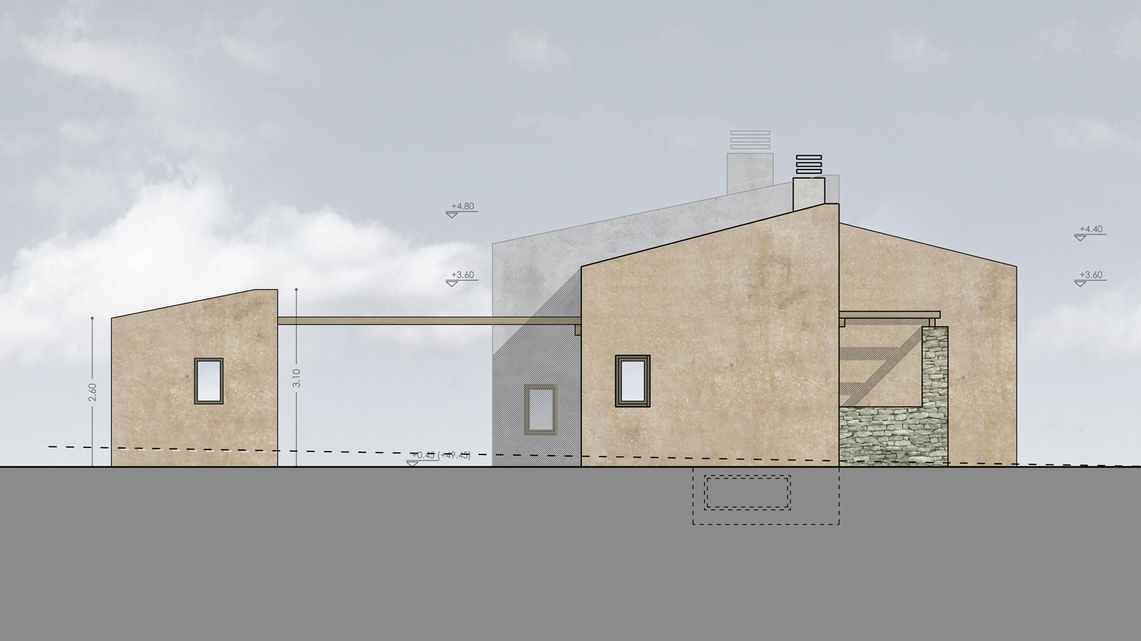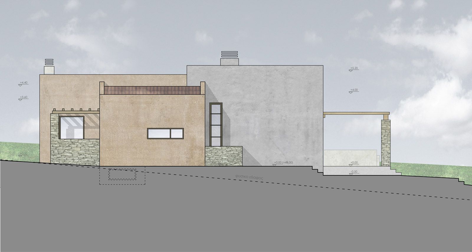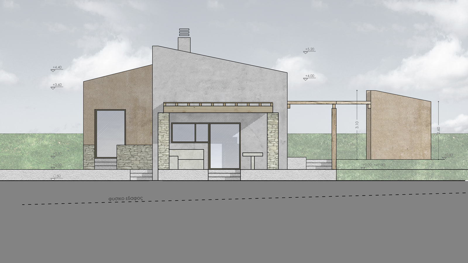 Το έργο αφορά τη μόνιμη κατοικία μιας τριμελούς οικογένειας σ’ενα αγροτεμάχιο έξω απο την Κασσανδρεία Χαλκιδικής.